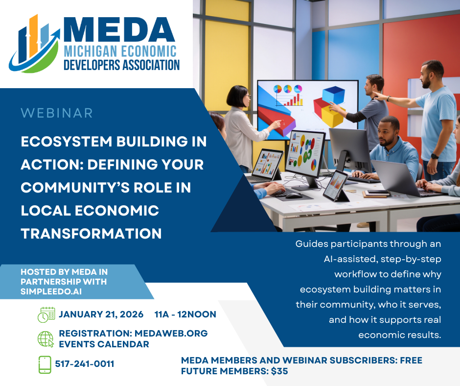 This 1-hour virtual workshop, hosted in partnership with the Michigan Economic Developers Association (MEDA), equips economic development leaders with a clear, practical framework for ecosystem building—and, critically, how it fits into their day-to-day economic development work.